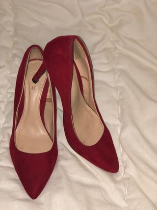 Elegantes zapatos de tacón de ante en color rojo. - Tacón grueso con tachuelas doradas. - Diseño de punta fina. - Material de ante. - Llevan almohadilla incluida. - Usados una sola vez. Precio negociable!