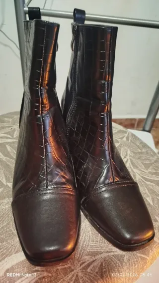 Botines de ante en color marrón, con un diseño elegante y moderno. - Detalle de hebilla dorada. - Cierre de cremallera lateral. - Tacón cuadrado. - Nunca usados, equivocación en la talla. - Precio negociable
