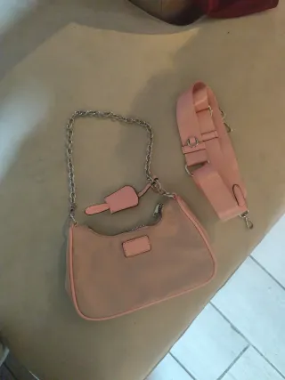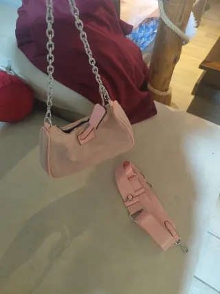 Bolso de mano con cadena y correa ajustable. - Color principal beige con detalles en rosa. - Incluye correa de hombro rosa. - Cadena metálica plateada.