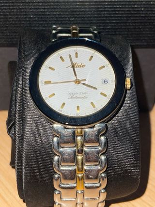 Reloj Mido Ocean Star Aquadura con movimiento automático. Un accesorio elegante y funcional. Sin caja original. MUY BUEN ESTADO : - Cristal impecable y todos los eslabones (26) - Esfera blanca con detalles dorados y circunferencua en azul zafiro - Brazalete combinado en plata y oro. - Ventana de fecha en la esfera. - Diametro esfera: 33mm