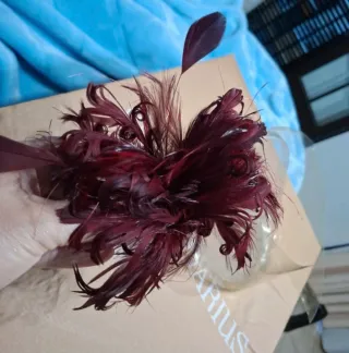 Elegante tocado adornado con plumas en tonos burdeos y morados, ideal para complementar tu atuendo en ocasiones especiales. - Diseño voluminoso y llamativo. - Plumas de diferentes tamaños y texturas. - Base discreta para sujetar.