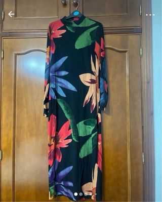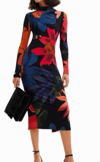 Vestido largo con un llamativo estampado floral sobre fondo negro. - Diseño de cuello alto y manga larga. - Corte ajustado que realza la figura. - Tejido elástico para mayor comodidad.