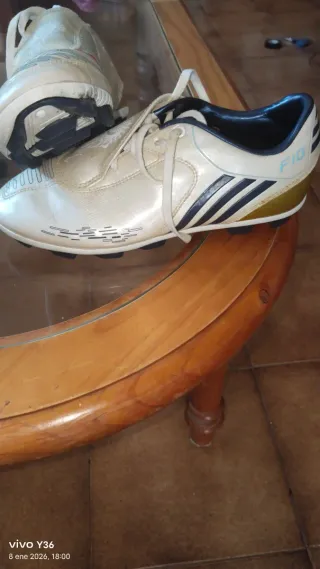 Botas de fútbol Adidas con un diseño llamativo en dorado y blanco. - Suela con tacos para césped. - Detalle de tres rayas laterales. - Logo de Adidas en la suela.