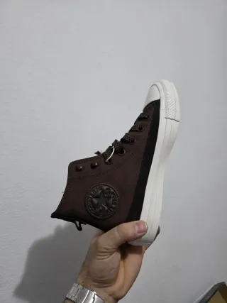 Zapatillas altas Converse con un diseño moderno. - Combinación de colores marrón y negro. - Detalle de tachuelas en la parte superior. - Logo circular de Converse en el lateral.