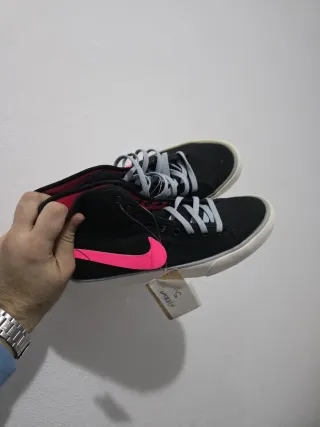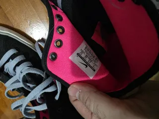 Zapatillas altas Nike con un diseño moderno. - Exterior de tela negra. - Detalle del logo Swoosh en rosa vibrante. - Forro interior en color rosa. - Cordones grises. - Suela blanca.