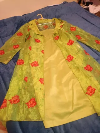 Conjunto Vestido y Chaqueta Verde Flores Rojas