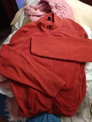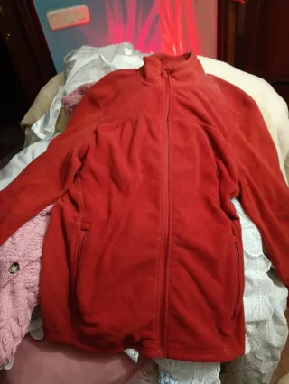 Sudadera polar de color rojo, ideal para mantenerte abrigado. - Cierre completo con cremallera. - Cuello alto. - Bolsillos laterales.