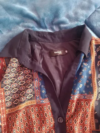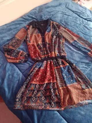 Vestido con un estampado vibrante y un tejido muy suave. - Cintura elástica para un ajuste cómodo. - Diseño con cuello camisero y botones. - Mangas largas.