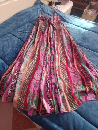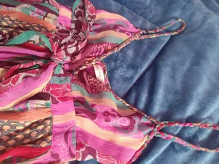 Vestido con estampado vibrante y tirantes finos. - Diseño con múltiples colores y detalles. - Tirantes trenzados.
