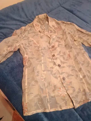 Chaqueta fina y transparente con un delicado bordado. - Diseño floral con hilo fino. - Tonos beige y grises.