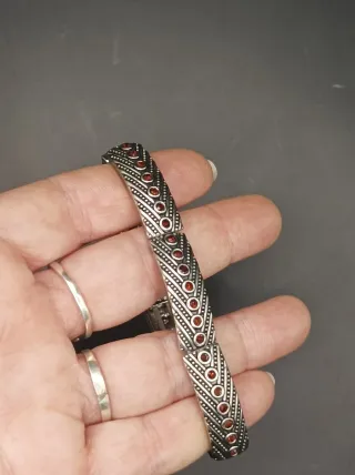 Pulsera elástica de metal y piedrecitas rojas Preciosa estilo boho de marca Paparazzi, metal no se estropea, esta en muy buen estado De cada sin fumadores, mira mi perfil, tengo muchas cosas muy bien de precio. Descuento por la compra múltiple.