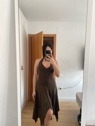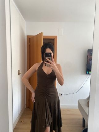 Vestido largo con escote halter y detalle fruncido en la parte delantera. Diseño asimétrico en la falda. - Escote halter. - Detalle fruncido. - Falda asimétrica.