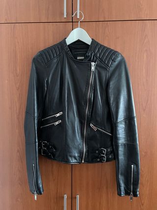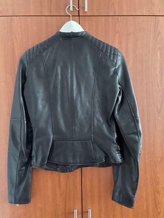 Cazadora de piel negra de Zara. Diseño motero con detalles metálicos. - Cuello mao con acolchado. - Cierre de cremallera asimétrica. - Bolsillos frontales con cremallera. - Puños con cremallera y hebillas.