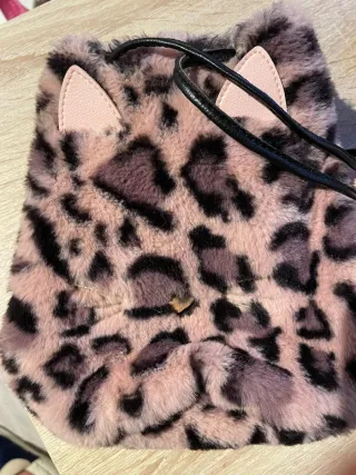 Bolso de peluche con estampado de leopardo y detalles de gatito. - Material: peluche suave. - Diseño: estampado de leopardo en tonos rosas y negros. - Adornos: orejas de gatito en la parte superior.