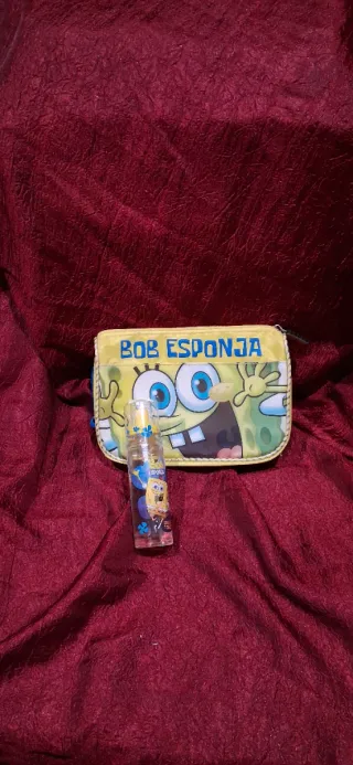 Set de neceser y colonia con diseño de Bob Esponja. El neceser es de color amarillo y la colonia viene en un frasco transparente. - Neceser con estampado de Bob Esponja. - Colonia con aroma infantil.