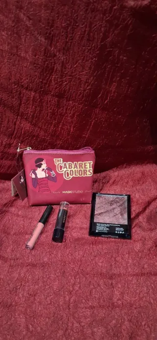 Estuche de maquillaje de la marca Magic Studio con un diseño inspirado en el cabaret. - Incluye un neceser rosa. - Paleta de sombras de ojos con cuatro tonos. - Barra de labios. - Brillo de labios.