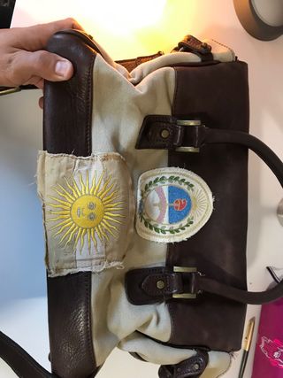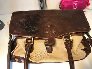 Bolso de piel La Martina de estilo vintage, con una combinación de colores beige y marrón. ✔️ tiene una mancha arriba y no me he atrivedo a limpiarlo porque necesita una profesional ! menos eso esta totalmente como nuevo ! - Diseño con solapa. - Cierre de hebilla. - Asas de mano y correa. - Detalles metálicos dorados.