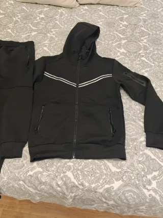 Conjunto de chándal deportivo. - Chaqueta con capucha y cremallera. - Dos bolsillos laterales con cremallera en la chaqueta. - Bolsillo adicional con cremallera en la manga. - Pantalón con cintura elástica y bolsillos con cremalleras. - Detalles de líneas plateadas en la parte delantera de la chaqueta.