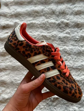 Zapatillas deportivas Adidas Samba con un bonito estampado de leopardo y detalles en naranja. - Diseño con las icónicas tres rayas blancas. - Forro interior en color naranja. - Suela de goma marrón.