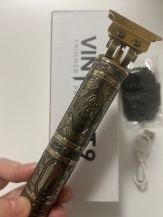 Máquina de afeitar de diseño vintage con acabados en dorado y marrón. Incluye accesorios para el corte y cable de carga USB. Muy eficaz y manejable.