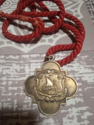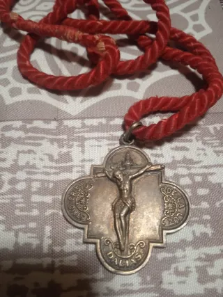 Medalla religiosa con forma de cruz y cordón. - Diseño de la crucifixión de Jesús. - Inscripción CRISTO SIMO y CRISTO DE LA LUZ DALIAS.