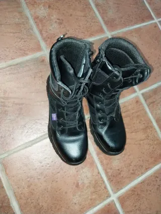 Botas militares de estilo robusto y funcional. - Cierre de cordones y cremallera. - Diseño de caña alta. - Detalle de etiqueta morada.