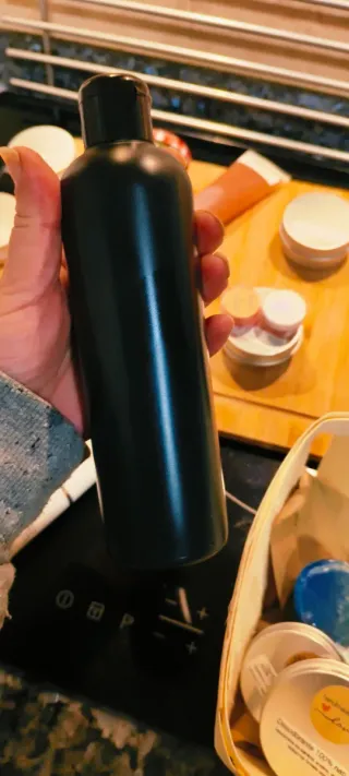 Conjunto de productos para el cuidado corporal y capilar. - Botella negra grande champú - Botella pulverizadora transparente. - Jabón artesanal con tonos azules y blancos.( Aguas profundas) - Varios envases pequeños de bálsamo o crema.