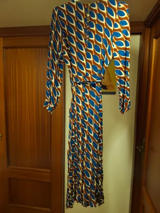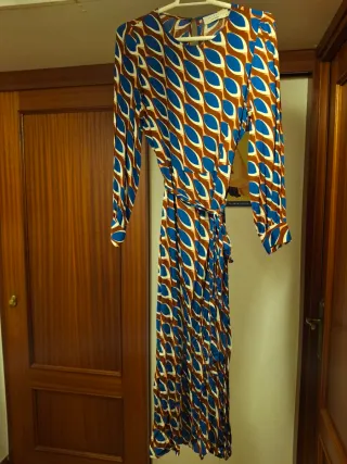 Vestido midi con mangas largas y un llamativo estampado. Está tallado como XS pero es una S-M - Diseño con cinturón. - Largo hasta la rodilla o por debajo. - Cremallera en la espalda. - Pequeña abertura trasera que cierra con botón.