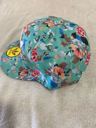 Gorra de estilo snapback con un vibrante estampado floral. - Diseño llamativo con flores y hojas. - Logo de Adidas en la parte frontal. - Visera plana. - Cierre ajustable.