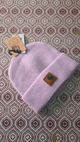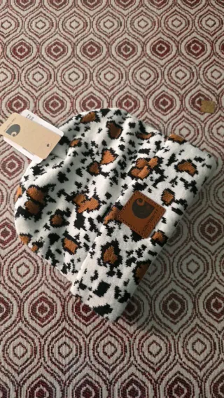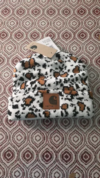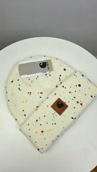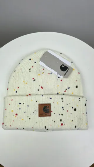 Gorro de punto Carhartt con un diseño llamativo. - Base de color blanco roto. - Estampado de salpicaduras multicolor. - Parche de cuero con logo en la parte frontal. Sin uso con etiqueta
