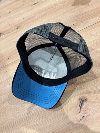 Gorra estilo trucker con paneles de malla. - Parte frontal gris con logo bordado. - Paneles traseros de malla azul. - Visera con costuras. - Cierre ajustable.
