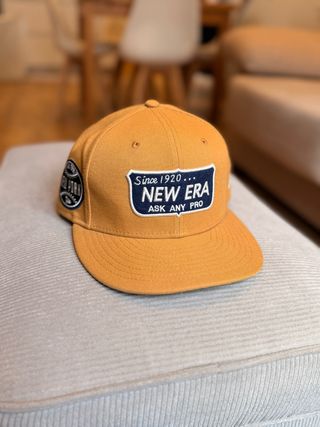 Gorra de la marca New Era con un diseño distintivo. - Parche frontal con el logo New Era Since 1920. - Detalle de parche lateral. - Color principal amarillo ocre.