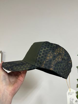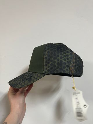 Gorra con un diseño único y llamativo. - Parte frontal en color verde con bordado de conejo. - Visera con estampado de camuflaje.