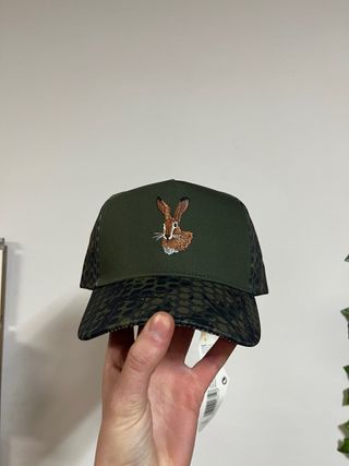 Gorra con un diseño único y llamativo. - Bordado detallado de una liebre en la parte frontal. - Paneles laterales con estampado de camuflaje.