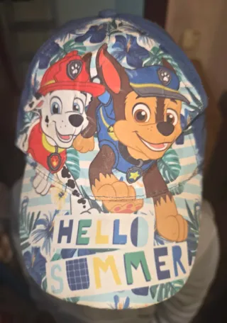 Ideal para el verano! Gorra infantil de color azul con un diseño muy alegre de la Patrulla Canina. En el frontal aparecen los personajes Marshall y Chase sobre un fondo tropical con flores y rayas, junto al texto "Hello Summer". Estado: En buen estado (ver fotos para detalle de los colores y tejido). Ajuste: Dispone de cierre de velcro en la parte trasera para ajustarse perfectamente a la cabeza del niño/a. Material: Tela resistente y transpirable, ideal para proteger del sol en días de playa, parque o excursiones.
