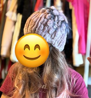 Gorro elástico de pelo natural, suave y cálido, perfecto para los días fríos. Su diseño combina tonos rosados y grises para un look moderno. Para cabeza grande.