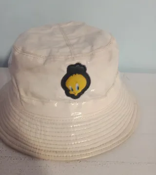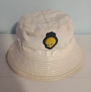Gorro de lluvia vintage con diseño de Tweety, de los años 2000. Ideal para protegerse de la lluvia con un toque divertido. - Diseño con personaje Tweety. - Estilo bucket hat. El gorro está un poco deteriorado al estar guardado en cajas mucho tiempo ( no usado) Tengo en stock 2 o 3 gorros Precio unidad 3 euros