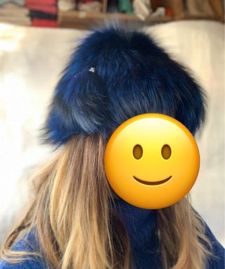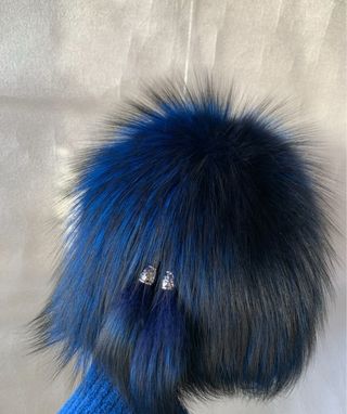 Gorro elástico de invierno con un diseño llamativo y cálido. - Material de pelo suave natural, de alta calidad. - Tonos azules y negro. Accesorio se puede quitar y llevar en el abrigo m, como un conjunto.