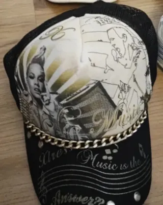 Gorra negra con diseño de Marimekko y detalles dorados. - Cierre ajustable. - Logo de Adidas. - Estampado floral característico de Marimekko.