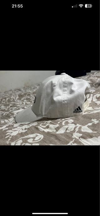 Gorra del Real Madrid con el logo del equipo y las tres franjas características de la marca. Gorra apenas usada si que es verdad que esta un poco arugada pero en un buen estado