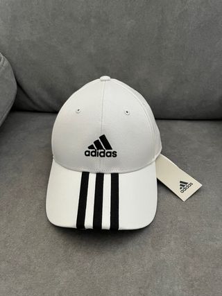 Gorra deportiva con el icónico diseño de Adidas. - Tres franjas negras en la visera. - Logo de Adidas en la parte frontal.