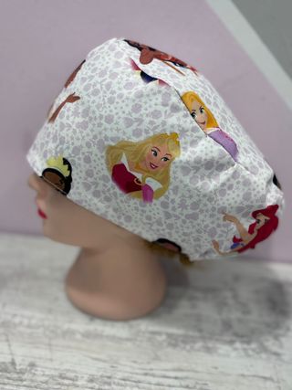 Gorro quirúrgico con estampado de princesas de Disney. Ideal para profesionales de la salud o para uso general. 100% algodón, se le pueden añadir cintas para atar y botones para sujetar la mascarilla - Diseño con varias princesas. - Tejido cómodo y transpirable.