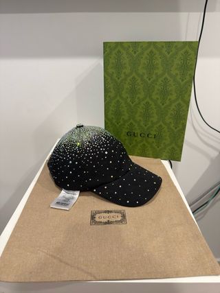 Gorra de béisbol de Gucci, adornada con cristales brillantes. - Diseño con incrustaciones de cristales. - Base en color negro.