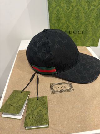 Gorra de la marca Gucci con un diseño distintivo. 100% original Talla m Con bolsa Precio en tienda 450€ - Patrón GG grabado en toda la superficie. - Raya característica verde y roja en el lateral.
