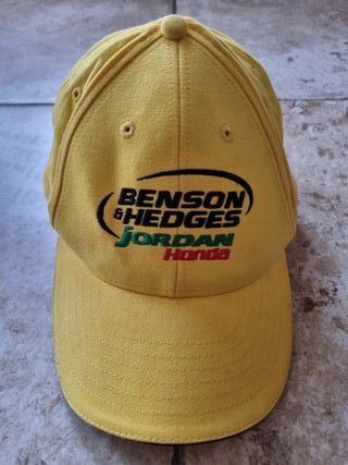 Gorra de la mítica escudería Benson & Hedges Jordan Honda de la temporada 2001 del Campeonato del Mundo de Fórmula 1. Heinz-Harald Frentzen y Jarno Trulli fueron los titulares a los mandos del Jordan - Honda EJ11, pero Frentzen fue sustituido por Ricardo Zonta y después por Jean Alesi. Muy buen estado, etiqueta cortada. Logos bordados al frente de la escudería. Cierre de velcro. #jordan #jordanf1 #jordangrandprix # #honda #f1 #trulli #jarnotrulli #bensonhedges #bittenheroes #formula1 #eddiejordan #frentzen #alesi #jeanalesi #zonta #ej11 #jordanhonda