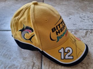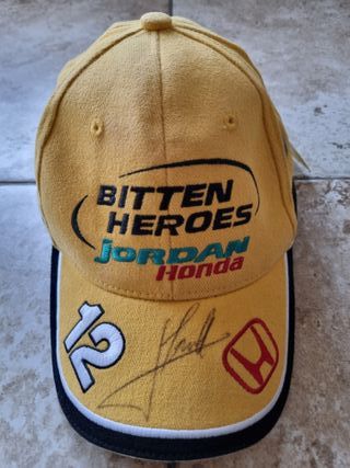 Gorra del piloto italiano Jarno Trulli cuando militaba en la mítica escudería Benson & Hedges Jordan Honda de la temporada 2001 del Campeonato del Mundo de Fórmula 1. A los mandos del Jordan - Honda EJ11 lograría finalizar en la 9ª posición en el campeonato. Merchadising oficial. Logos bordados al frente de Jordan, de Honda y el dorsal del piloto en la visera, en ambos laterales de la mascota Bitten Heroes y en la parte trasera emblema del piloto. Cierre de tela bordado con la web del piloto y con hebilla metálica. Con sus etiquetas y firmada a mano. #jordan #jordanf1 #jordangrandprix # #honda #f1 #trulli #jarnotrulli
