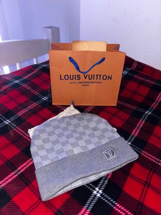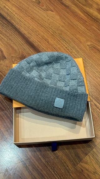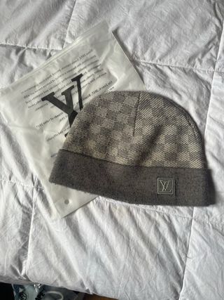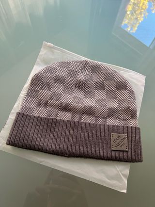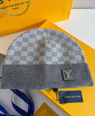 Gorro de invierno con el clásico estampado Damier de Louis Vuitton. - Diseño a cuadros en gris. - Banda inferior lisa en gris oscuro. - Parche con logo LV en la banda. #LouisVuitton #GorroLV #GorroInvierno #GorroGris #AccesoriosDeLujo #ModaInvierno #ModaHombre