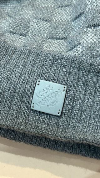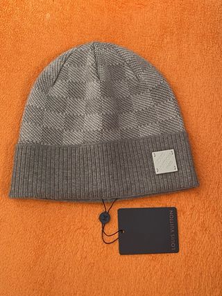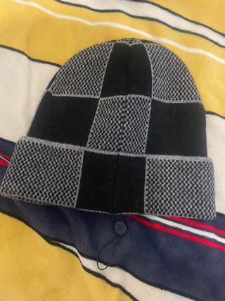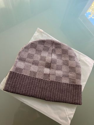 Gorro de punto con el icónico patrón Damier de Louis Vuitton en tonos grises. - Diseño Damier. - Detalle de placa en piel con logo LV - Usado el invierno pasado 5 veces