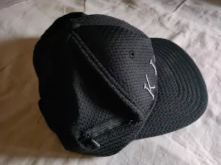 Gorra Kangol negra con un pin de Flying Money (dinero volando). - Diseño de malla. - Pin metálico con alas y símbolo de dólar.