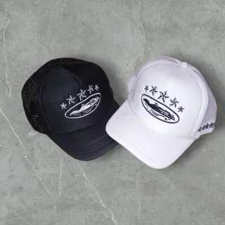 Gorra de la marca Corteiz con un diseño moderno. - Estilo trucker con paneles de malla. - Detalle de logo en relieve en la parte frontal. - Visera curvada con costuras.